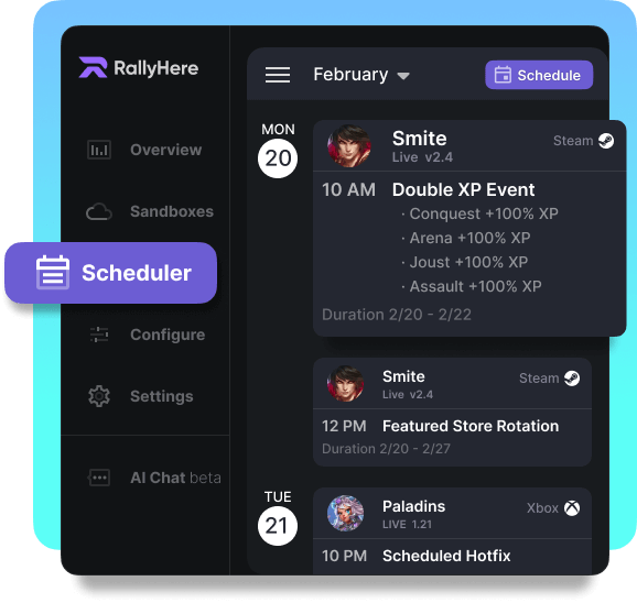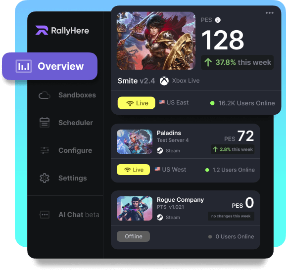 RallyHere’s fully-integrated product suite enables streamlined game development through our foundational services. We offer unified account management, player state, and session management. Once live, easily manage your game through LiveOps tooling and analytics. We work by your side to continuously monitor the performance and health of your game.